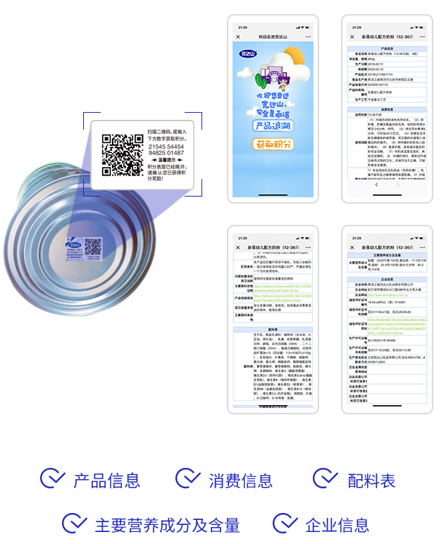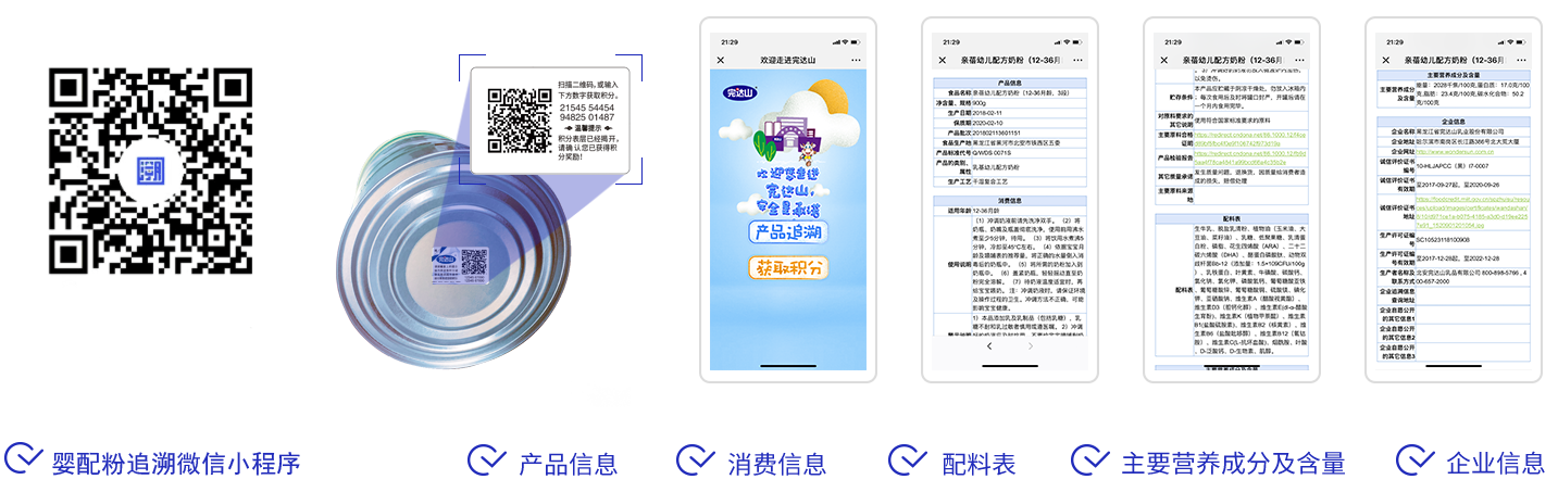 在市場(chǎng)上拿到任意一款完達(dá)山嬰幼兒配方奶粉產(chǎn)品通過APP、微信以及打開完達(dá)山官網(wǎng)查詢?nèi)肟冢?br> 登錄到食品工業(yè)企業(yè)追溯平臺(tái)或掃描產(chǎn)品二維碼,均可查詢到與產(chǎn)品質(zhì)量、產(chǎn)品追溯相關(guān)的四大類31項(xiàng)追溯信息。